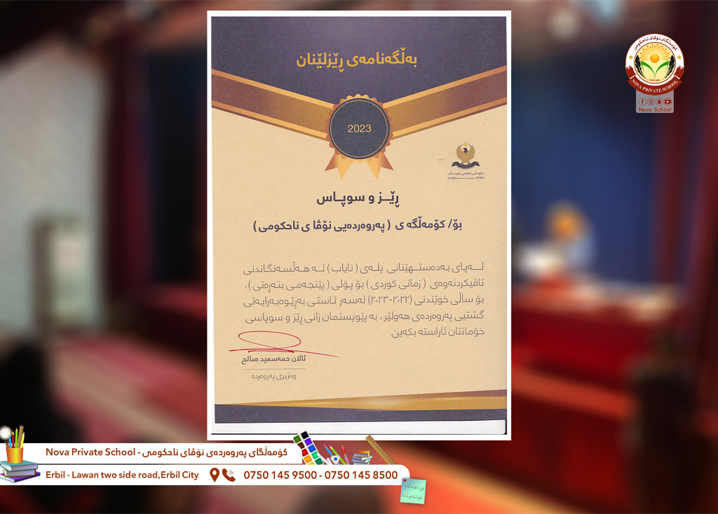 بەهەوڵ و ماندووبوونی بێوچان و سەرکەوتن بەسەر گشت ئاستەنگەکاندا، کۆمەڵگای پەروەردەیی نۆڤای ناحکومی توانی لەکۆی (٨٠) قوتابخانە پلەی (١٩)هەم لەسەر ئاستی پارێزگاکانی کوردستان بەدەست بێنێت، لە تاقیکردنەوە و هەڵسەنگاندنی قوتابییانی پۆلی پێنجەمی بنەڕەتی،لەبابەتی زمانی کوردی. بەم بۆنەیەوە پیرۆزباییەکی گەرم لەخۆمان و مامۆستا و قوتابیی و بەخێوکارەکانیان دەکەین، کە هەموو کات دەست لەنێو دەست توانیومانە بەسەر هەورازە سەخت و دژوارەکاندا سەرکەوین. بەئومێدین بەدەستهێنانی ئەم پلە نایابە پەڕینەوەیێکی زانستی و ئەکادیمیانە بێت بۆ کارەکانی لەمەودواشمان.